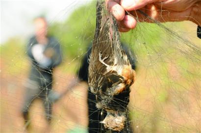 “这个山头又架起大网了,一定要赶快上山解救触网小鸟。”昨天凌晨4时许,记者跟随森林公安执法人员,赶到位于即墨田横镇的登高山。执法人员指着山头上的几根杆子说,那些都是捕鸟张下的大网。为了确保执法力度,执法人员兵分三路向山顶围歼,记者跟随其中一路向山上赶去。