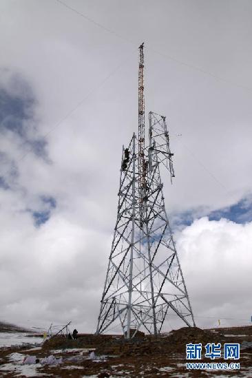 在海拔4800多米的巴颜喀拉山南麓,玉树电网与青海主网330千伏联网工程正在进行塔架吊装(10月27日摄)。目前,作为国家玉树灾后重建重点项目之一的玉树与青海主网330千伏联网工程正加紧建设。该工程贯穿玉树、果洛、海南三个藏族自治州,线路全长800多公里,其中海拔4000米以上线路482公里。工程总投资超过24亿元,预计于2013年6月投入运行,建成后将从根本上解决玉树地区缺电问
