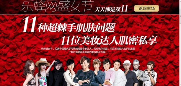 2012年11月1日,北京—— 中国领先的化妆品垂直电商乐蜂网今天宣布“乐蜂网11月盛女节,天天都是双十一“大规模促销活动全面启动。 本次促销活动以“500个品牌脱光利润,11位达人教你美丽”为口号,通过提供丰富、、低价、高品质的美妆产品,为广大女性消费者在11月中倾力打造一个美妆盛宴,同时,乐蜂网还携手11位知名美妆达人老师,针对不同气质的女性朋友做一对一的时尚指导,提供个性化的美丽解决