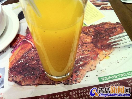 是第一次去绿茵阁就餐,“晚上八点多了,朋友跟我都很饿,就在他的推荐下走进了绿茵阁。店内装修用色很诡异,感觉挺阴郁的,不过朋友说东西还行,我们就点了牛排开始等待。”