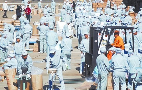 当天上午10时,圣元营养食品有限公司大院内不断传出叮叮当当的敲击声,记者看到200多名工人没有在生产线上忙着生产奶粉,而是在发货区拿着锤子砸开一个个铁罐,将奶粉倒入旁边的牛皮纸饲料袋。