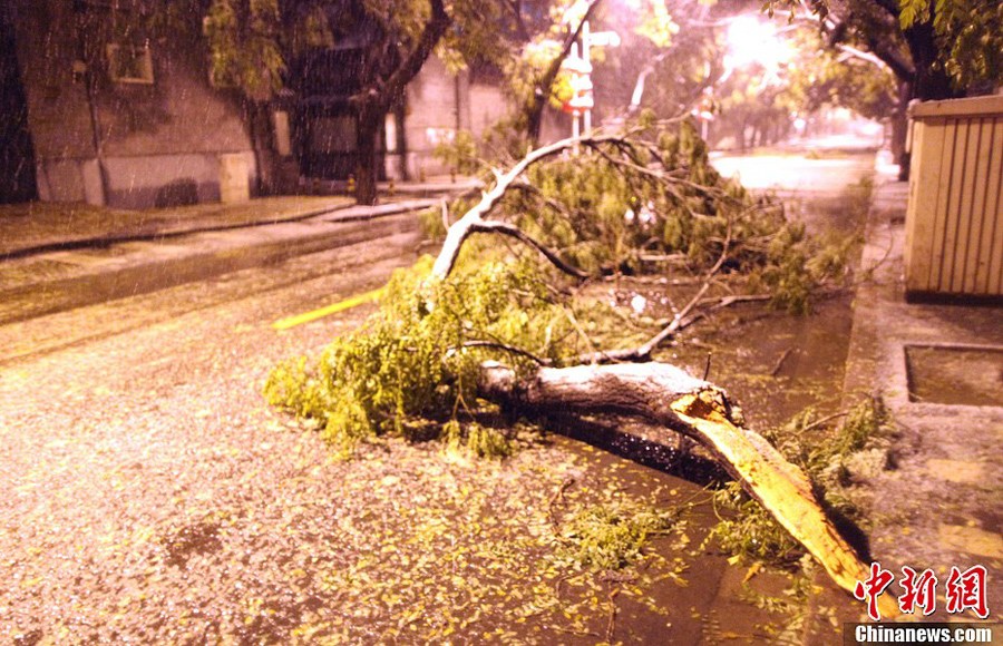 11月4日凌晨,北京的持续中雨因大风降温改为雨加雪,降下年度初雪,城区部分地区降雪量超过10厘米。图为当日北京大风降温雨雪天气夜景。
