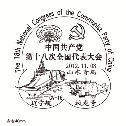 为满足集邮爱好者的需求,青岛市邮政局还特启用纪念邮戳一枚,邮戳融合了人民大会堂、党徽、航母、蛟龙号等元素,思路新颖,主题明确。
