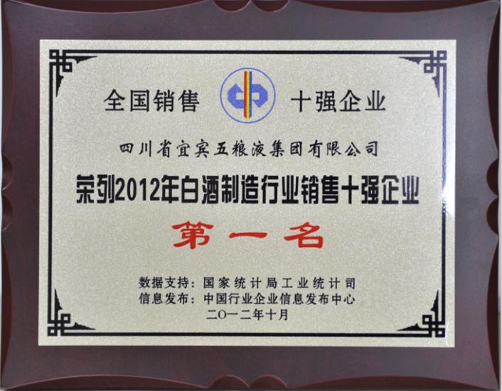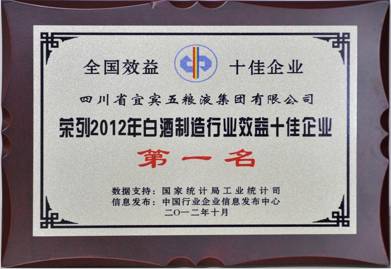10月27日,中国行业企业信息发布中心在山东烟台发布《2012年全国工业重点行业“效益十佳”“销售十佳”企业研究报告》。其中五粮液公司在“2012年白酒制造行业全国‘效益十佳’和‘销售十强’”两个排名中均列榜首。