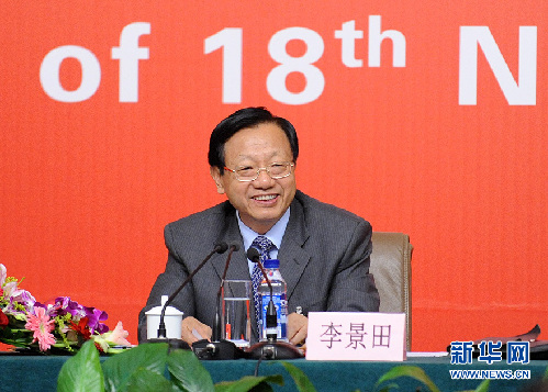2012年11月9日,十八大新闻中心在梅地亚中心举办主题为“中国共产党的理论创新”的集体采访。中央党校常务副校长李景田,中国社会科学院党组副书记、常务副院长王伟光接受采访。图为李景田回答记者提问。新华网陈竞超 摄