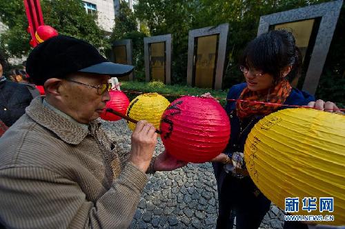 11月11日,70岁的秦咸宜老人(左)在灯笼上书写“热烈祝贺党的十八大胜利召开”。
