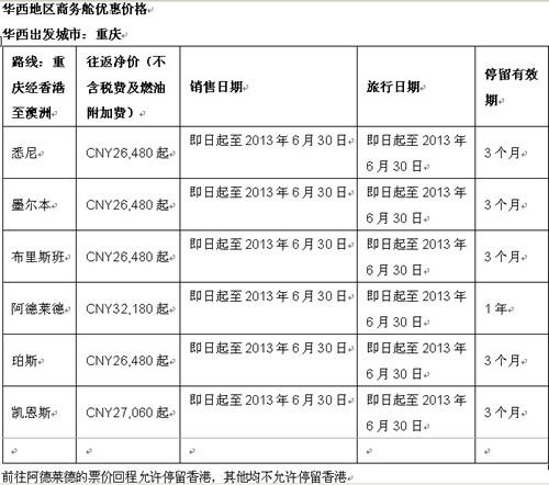 港龙航空联同国泰航空每周共有84班航班由内地经香港飞往澳大利亚六大城市——悉尼、布里斯班、阿德莱德、珀斯、墨尔本、凯恩斯。港龙航空及国泰航空为计划前往澳大利亚的乘客提供多种超值机票,以满足不同的出行需求。即日起至2013年3月31日,由北京和青岛出发前往悉尼及墨尔本,分别只需人民币3,600元起及2,900元起; 前往布里斯班分别只需人民币4,500元起及4,000元起;前往珀斯,分别只需人民币3,600元起及3,900元起。由重庆出发前往悉尼及墨尔本,只需人民币2,700元起;前往布里斯班及珀斯,只需人民币3,940元起。即日起至2013年3月31日,由华东各城市,包括上海、南京、杭州及宁波出发,前往悉尼及墨尔本,只需人民币2,190元起;前往珀斯、凯恩斯(需提前28天购票)分别只需人民币2,660元起及3,310元起。 (商务舱优惠价格请见文后表格)。