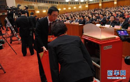 11月14日,中国共产党第十八次全国代表大会闭幕会在北京人民大会堂举行。 这是监票人和工作人员在检查票箱。新华社记者李学仁摄