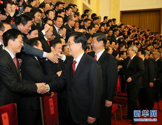 11月15日,国家主席胡锦涛,新当选的中共中央总书记、中共中央军委主席习近平等领导同志在北京人民大会堂亲切会见出席党的十八大代表、特邀代表和列席人员并发表重要讲话。这是胡锦涛和习近平亲切握手。新华社发