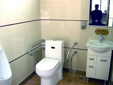 这座漂亮的公厕内除了管理间、男女厕位、洗手盆等常见的设置外,还有老人间,里面除了有扶手外,还首次设置了报警按钮,如厕老人遇到紧急情况随时可以按按钮呼叫保洁人员。朱继强说,这座占地80平米的公厕,使用的技术都是国内最先进的,造价也不便宜,因为使用了特殊材料,实现了冬暖夏凉,而且主体材质是钢架结构,还能随时拆走移动,一天时间就可以换个地方。