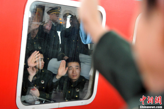 11月25日,在山西太原火车站,武警山西总队2000余名退役士兵开始返乡。图为列车启动时,这些大多年龄为“90后”的退伍老兵依依不舍的挥别昔日战友。