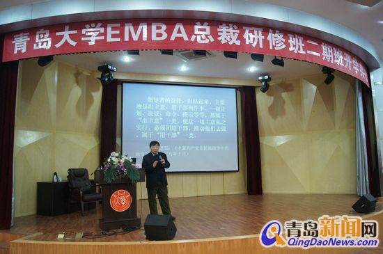 青岛大学EMBA总裁研修班二期班开学典礼一期班常务副班长国信(香港)集团有限公司董事长刘淑芬同学代表老同学发言,欢迎新同学的到来;青岛琅琊台集团董事长李悦明同学代表EMBA总裁班二期班新同学发言。 开学典礼结束之后,江英教授为青岛大学EMBA总裁研修班同学主讲了两天的核心课程《打造领袖魅力:毛泽东统帅之道与企业经营》。