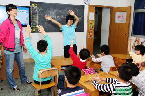 “我像只鱼儿在你的荷塘 只为和你守候那皎白月光 …….”在《荷塘月色》的欢快旋律下,孩子们扬着小脑袋,在2位老师的指挥下边唱边摆手。你以为他们在上音乐课?错,这是广州康复实验学校小学部二(1)班在上动作训练课。