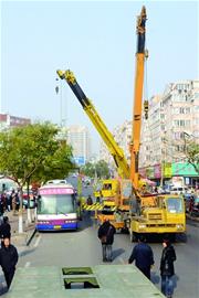 昨天上午10时,两辆大型吊车和一辆大型拖车来到现场。“我们测量了一下,这辆大客车长12米,一辆吊车吊不起来,普通拖车还放不下,只好弄来了三个‘大家伙’。”现场负责吊车的某公司负责人告诉记者,他们的拖车长度超过了20米,拖两辆坦克都没问题,公司还专门特制了工具来固定大客车。