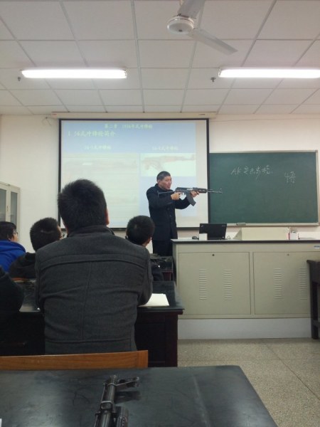 老师讲解AK-47自动步枪。 老师在讲台上一手拿着AK47突击步枪,一手拿着M16突击步枪,这种画面是否足够震撼?南京理工大学有一门“自动武器构造课”,课堂上的照片流传到网上,把网友们给“震”住了。大家感慨,“估计这个课没人敢逃。”不过同学们说,没人舍得逃这门课,一堂课摸到30支各国枪械的机会,实在太难得。