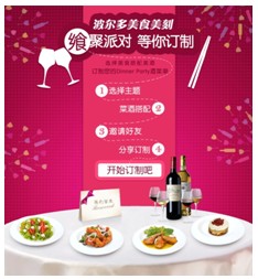 12月3日至20日,波尔多葡萄酒官方微博将推出“飨聚派对,等你订制”APP游戏,网友可选择三大最潮主题的聚餐派对“吃货轰趴记”、“闺蜜私飨记”、“同僚搜食记”,为自己的个性聚餐订制服饰主题、音乐推荐、场景布置等不同元素,其中聚餐派对菜单与酒单搭配乐趣无穷——共16款最具代表性的地道中国美食和8款来自波尔多干白、甜白及左右岸干红等不同家族的葡萄美酒,任网友随性混搭,以奇思妙想点燃用波尔多美酒搭配中餐的灵感。最后网友可通过微博将一份亲手“订制”的“聚餐派对邀请函”发送给自己的亲朋好友,激发大家的妙搭灵感,一起探索并享受东膳西酿的搭配乐趣,感受美妙的聚餐派对时刻。