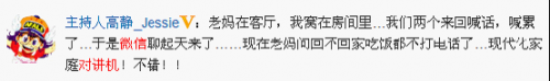 网友热评:“现在老妈问回不回家吃饭都不打电话了,现代化家庭对讲机!不错!”主持人高静在微博上透露了微信对讲功能给她带来的新家庭通讯体验。