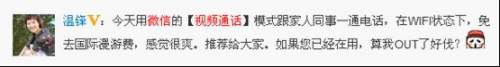 网友热评:通过视频通话,通讯更方便,资费也更节省了。网友温锋表示,“微信视频通话模式在WiFi状态下,免去了国际漫游费,感觉很爽。”