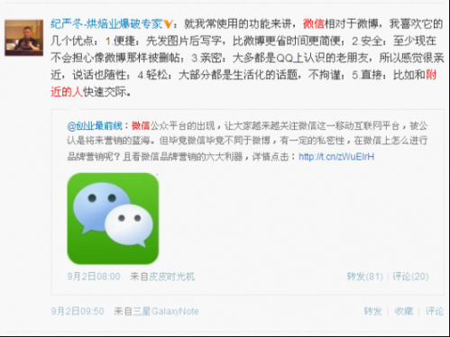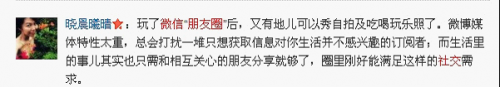 网友热评:自从微信推出“朋友圈”从此就爱上了这项功能,没事可看看朋友的近况,也可以通过照片来交流活动,非常体贴。网友“北极星里的爱”直言,“微信很不错,分享的朋友圈能知道朋友的近况。我支持。”