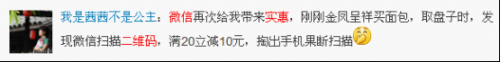 网友热评:微信“二维码”不仅可以帮助用户快速扫描并添加好友,而且可以通过二维码电子会员卡享受到更多的实惠。网友“我是茜茜不是公主”表示“微信再次给我带来实惠,刚刚金凤呈祥买面包,取盘子时,发现微信扫描二维码,满20立减10元,掏出手机果断扫描”