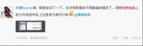 网友热评:微信与PC端的完美互通,不仅体现在输入文字更方便,同时传送图片等文件也更加便捷。“孙婕Audrey”说,“刚刚尝试了一下,在没有数据线不用邮箱的情况下,用微信把电脑上的文件传到手机上还是很方便可行的。”