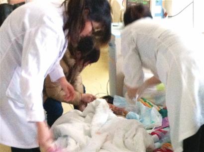急救车一路狂奔,宝宝一路大哭不停,牟先生和冷女士心急如焚,不停催促司机快点开。晚上10时50分,终于赶到401医院,可医生在看过伤情后,仍然无法医治宝宝的胳膊。牟先生说:“我急得不行,给值班大夫跪下了,但医生没法治孩子,我们只能再次转院。 ”晚11时30分,牟先生一家人又坐120赶到青医附院急诊室,在初步查看伤情后,宝宝又被转入小儿外科接受进一步治疗。经检查,宝宝伤情严重,医生先为孩子进行了活血处理。