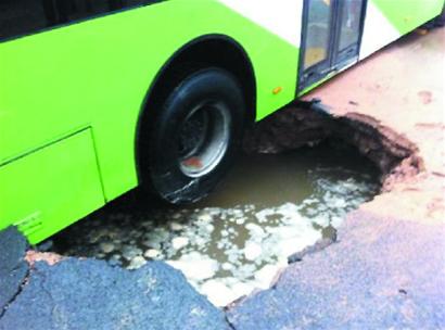 当时正在公交车上的市民周先生告诉记者,早上6时40分许,他乘坐的25路公交车沿着延安三路自南向北行驶,当时他看到道路东侧有一些积水,有几名交警已经赶到现场指挥。公交司机看到前面有两辆私家车通过之后,也紧跟着通过,不料后轮却突然沉了下去,司机猛踩几脚油门也无法脱离困境,公交车反而越来越向下。司机发现事情不对,立即打开后车门让乘客全部撤离,下车后,周先生这才发现公交车后轮已经陷在一个马路“泉眼”里,大量的清水顺着延安三路向香港路流去。随后,交警部门调来拖车拖离公交车,不料后轮悬空无法正常拖车,附近工地的铲车过来帮忙把公交车屁股抬起来才将公交车救出“困境”。