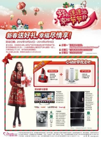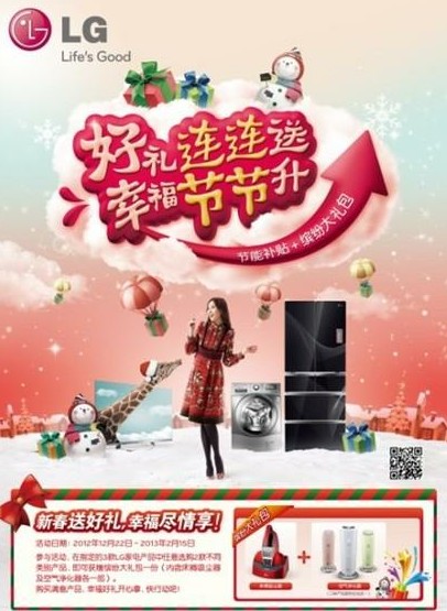 LG年末促销狂欢盛装登场,好礼连连送 幸福节节升!多重节能补贴带给你十足实惠,更有缤纷豪礼相送,LG家电倾心为你打造智能、清新又健康的温暖冬日,喜迎春节。即日(12.22)起至2013年2月15日,只要购买LG部分型号的洗衣机、冰箱或Cinema 不闪式3D电视产品中的任意两款不同类别的产品,即可获赠包含床褥吸尘器及空气净化器各一部的缤纷大礼包。另外,购买符合国家一级节能标准的LG冰洗产品,还能最多享受800元的现金优惠! LG超大容量滚筒洗衣机 新春扫除好帮手