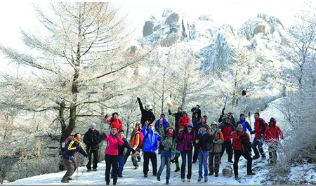 2011年的元旦,山东青岛天降小雪。游客们身穿登山服、脚踏登山鞋、打着背包、带着午餐沿着崂山山路向着大山深处进发,登山赏雪,回归自然。