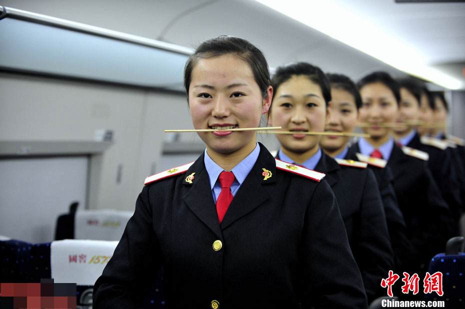 12月19日,西安客运段的高铁乘务员正在进行服务技能训练。近日,西安铁路局西安客运段动车队对即将上岗的西安至北京高铁乘务员进行服务礼仪、安全作业等方面的强化培训,为京广高铁正式开通运营做准备。京广高铁北京至郑州段将于12月26日开通运营,郑西高铁同步调整列车运行图。届时,西安至北京将开行10对高铁动车组列车,最短运行时间为4小时40分。(中新社发 唐振江 摄)