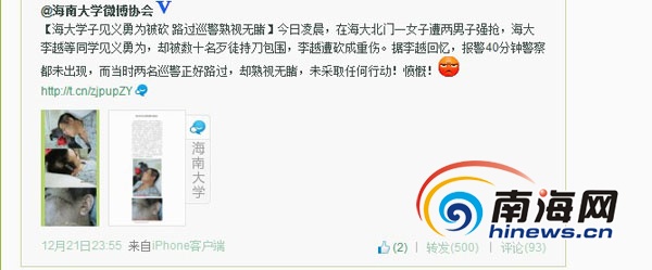 12月21日南海网报道了《海大男生抓小偷遭多名持刀男报复砍伤》引起了广大网友的关注。12月22日,记者从海口红岛边防派出所了解到,案件已经移交美兰公安分局刑警队侦办。而对于今天有学生在微博上质疑警方出警慢、没有及时抓获持刀伤人的嫌疑人,让其从现场跑掉。目前,海口美兰公安纪检部门介入调查。