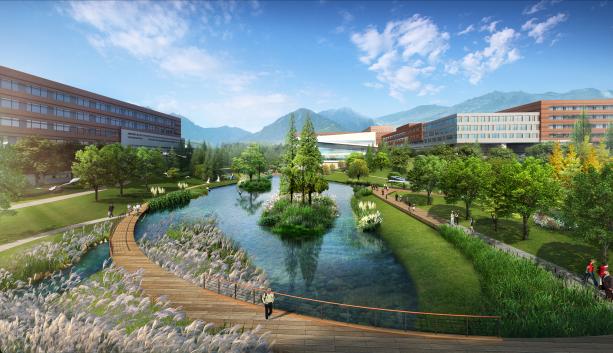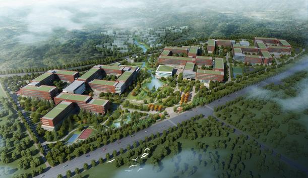 海信崂山研发基地鸟瞰图及学术中心效果图