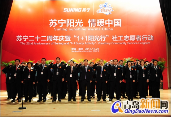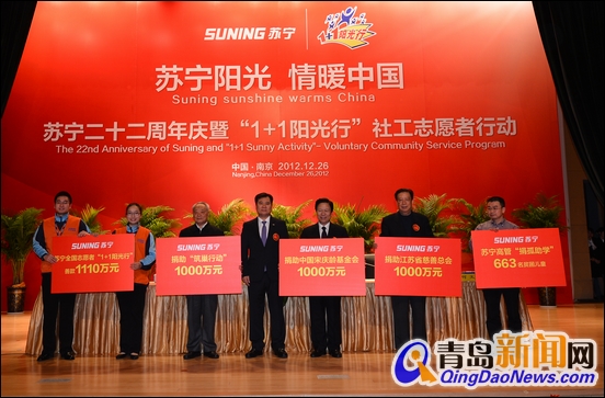 苏宁二十二周年“1+1阳光行”社工志愿者行动启动仪式 2012年12月26日,圣诞元旦双节期间,各大商家纷纷上演促销大战,而苏宁全国200多家分公司(含香港)同时举办的公益活动,为节日氛围增添了额外的温暖。上午10时许,苏宁延续公益庆生传统,苏宁公司及苏宁员工共捐赠4140万元,同时两百多家分公司同步开展关爱老人、留守儿童、贫困家庭等多种送温暖活动。