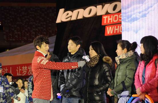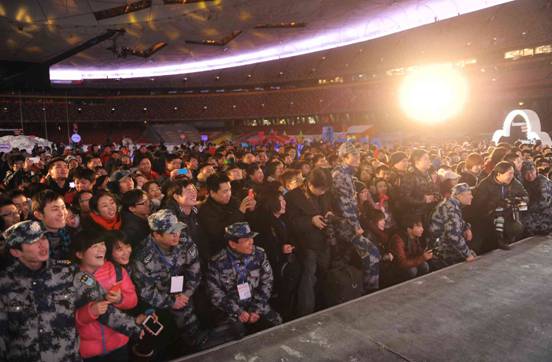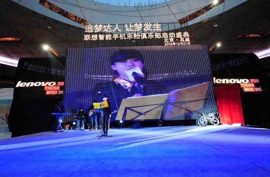 17:00 PM,随着聚集在鸟巢中央的乐粉越来越多,“盛典”正式开始。舞台上,歌手声情并茂的演唱;活动专区,各式联想新品手机的试玩;游乐设施,各种趣味横生的冰雪项目,这一切都让乐粉们的频率调至“狂欢“。