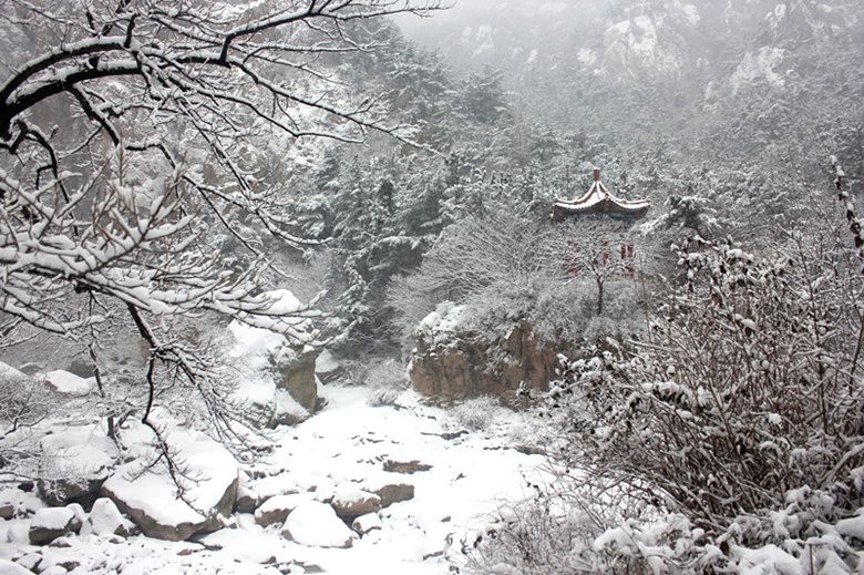 据崂山北九水景区工作人员介绍,山里积雪没过脚踝,将近10厘米厚。(通讯员 曲健)