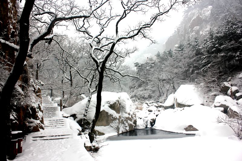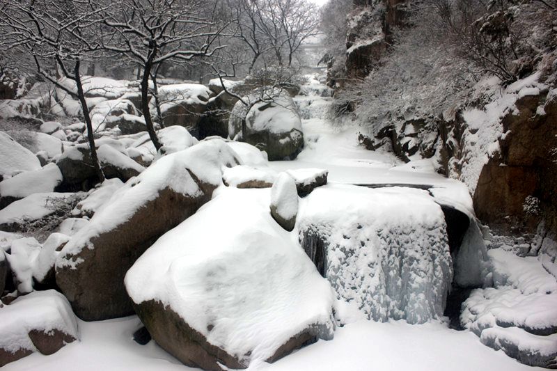 首发:崂山景区大雪封路 北九水积雪10厘米(组图)