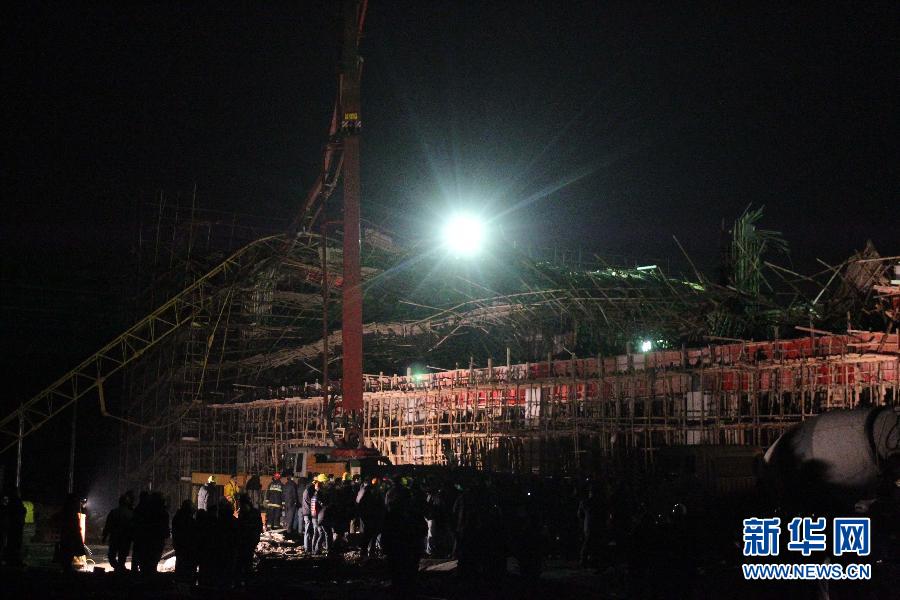这是发生坍塌事故的现场(2012年12月31日摄)。记者从上海市政府新闻办和市安监部门获悉,2012年12月31日21时左右,位于上海浦东新区金穗路、由上海建工二建集团承建的轨道交通12号线金桥停车场地面检修库房,在施工过程中浇筑平台发生坍塌,事故当时造成1人死亡,10余人受伤,截至1日上午8时发稿时,事故死伤人数已升至5人死亡,18人受伤。目前,上海已成立了由市安监局牵头和有关部