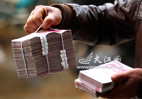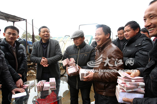 1月6日,天寒地冻,一场令人热血沸腾的农民年终颁奖大会在安义县鼎湖镇一农家大院举行:院子中央的一张小玻璃桌格外令人关注,桌上搁着厚厚一堆现金,共有140多万元!被叫到名字的农民挨个上前,喜滋滋从种粮大户凌继河手中领取年终奖。其中,仅“种粮状元”刘高美一人就获得了16.3万元奖金。