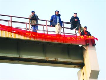 昨晨8时许,记者接到市民李先生报料电话后迅速赶到现场,七名工人站在10多米高的龙门吊上拉开一条横幅,上面写着“企业拖欠工资”、“求做主”等字样,由两名双腿悬空的工人各持一边紧紧拽住。“早晨8点刚过就坐在上面,当时他们脚都耷拉在半空中,相当危险。 ”一名路人介绍道。