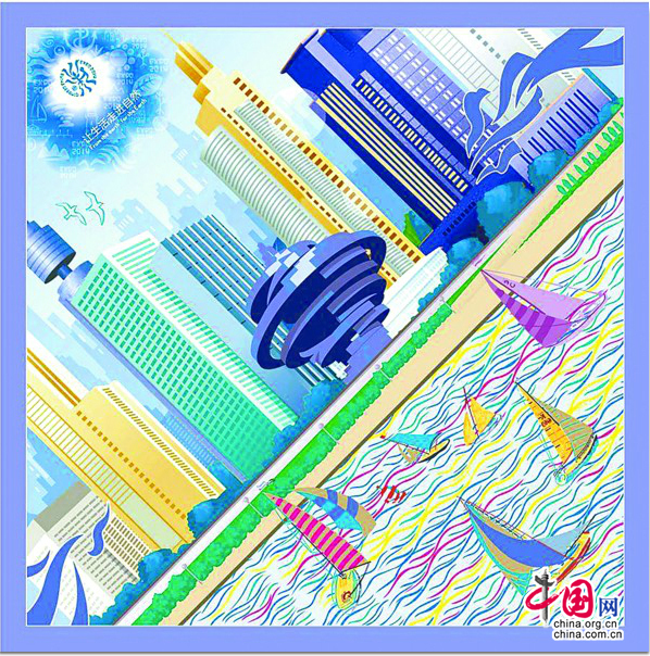 青岛风光系列丝巾有A、B、C、D四款,A、B以青岛的建筑、国际帆船节、人文艺术以及整个以蓝色为主的自然画面。C、D以会徽的辅助图形为基本元素,灵活的采用打散重组的方式进行排版设计,中心图案以青岛具有代表性的景物符号绘本为主体,以山、水、日、月等表现大自然的象形文字组合,展现出青岛山海城浑然一体的深厚文化特色。