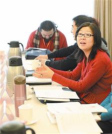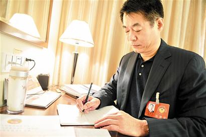 委员郑佳先就学生午餐食品安全问题整理提案(图片来源:青岛日报 王群 摄)