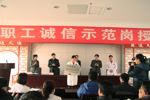 仪式上,医院院长颜晓波介绍了医院在创建活动中的做法,获得“青岛市职工诚信示范岗”的冯佩青代表检验科做了表态发言。区总工会常务副主席王建礼充分肯定了医院的工作,能把创建“职工诚信示范岗”与建设文明和谐黄岛紧密结合起来,有效促进了活动扎实深入开展,取得了良好的社会成效,特别以检验科为代表的区第一人民医院广大干部职工立足卫生服务行业特点,紧密围绕“诚实守信”服务品牌,诚信敬业,优质服务,走出了一条为患服务的好路子,取得了良好的经济效益和社会效益。
