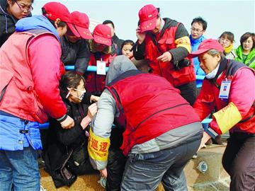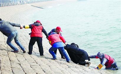 “轻生女子被推到海边的台阶上后,还是拼命挣扎,就是不想往岸上走。”万女士介绍说,她的另外一名同事便顺着斜坡下到轻生女子身旁,准备和付守库一起将轻生女子拖到岸上,但轻生女子还是使劲要往海里走,凭两个人的力气很难将她弄到岸上。“最后,我们五六个人都上去了,手拉手接力,付守库在后面推,我们就在前面拉,费了很大的力气,才把她弄到了栏杆里面。”当时参与救援的崔师傅告诉记者。