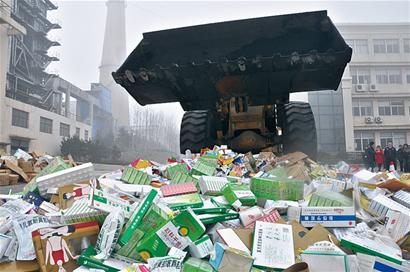 记者在销毁现场看到,规格各异、品种繁多的药品堆积得像座小山。随着指挥人员一声令下,轰隆隆的大型铲土机缓缓地爬上“药山”,一阵阵“噼噼啪啪”过后,原本包装精美的药品变得面目全非。经过反复碾压,这些药品被送进煤炉,彻底焚毁。