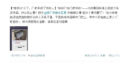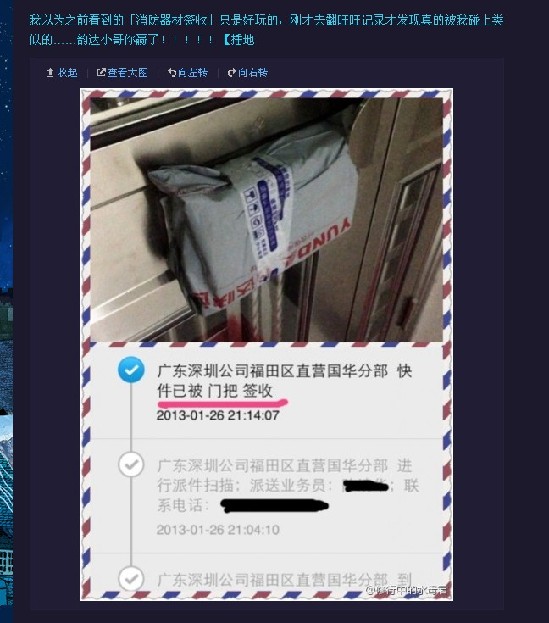 1月28日,网友@修行中的水母君在微博上发出了这样一条帖子:“我以为之前看到的"消防器材签收"只是好玩的,刚才去翻旺旺记录才发现真的被我碰上类似的……韵达小哥你赢了!!!”该网友随微博发出了一张快递物流信息截图,图片上显示,一个包裹被裹在门把手上,而下面物流公司返回的跟踪信息上写道:“广东深圳公司福田区直营国华分部,快件已被门把签收”。该微博发出后,迅速引起网友们的“高度”关注,记者发稿时,该微博转发次数已达近8000次,网友评论也有1000多条。