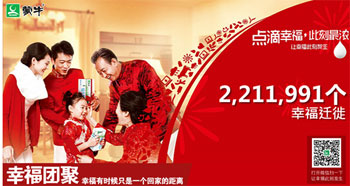 知名乳企蒙牛集团与依托自身的影响力,也发起了主题为“点滴幸福,此刻最浓”的春节线上活动。而活动中最大的亮点,应该就是“最科技团年饭”了。利用多媒体视频技术、选择年味十足的餐桌,将从网络活动中征集的北京、上海网友济济一堂,与家人共同体验一次“数字化”的年夜饭。这种新颖独特的年夜饭形式,即解决了与家人的沟通、也能让同为“留守族”的陌生人走近,真正感受年的滋味。