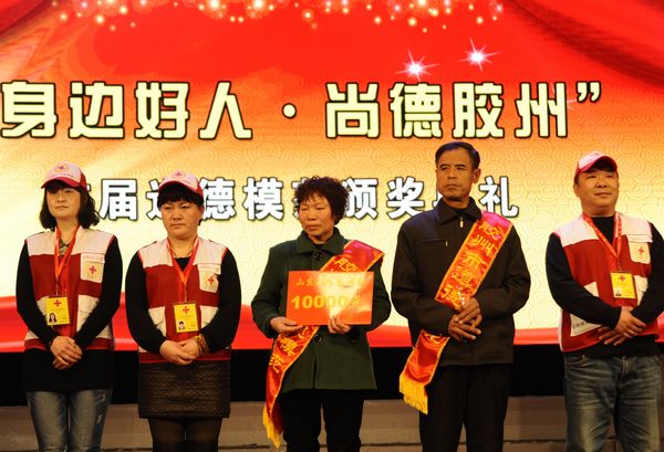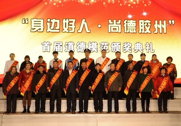 青岛新闻网2月5日讯 2月4日上午10时,以“身边好人·尚德胶州”为主题的首届道德模范颁奖典礼在胶州市人民会堂激情上演。一幕幕感人的场景,一股股道德的暖流,让泪水一次次打湿了现场观众的双眸,众多身边普通人的善举带来的道德力量,给人以强烈的心灵震撼。