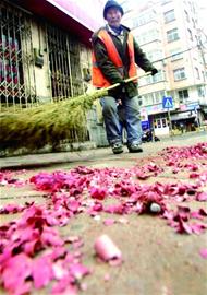 昨天凌晨4点,在霏霏细雨中,47岁的贾云芹和对象王焕玉就赶到了利津路客运站处清扫马路,这要比往常提前了一个小时。“想到大家放了鞭炮,地上的爆竹皮会很多,所以早起来扫地。”出乎贾云芹的意外,地面上的爆竹皮比去年少了很多,不过由于下雨,红色的纸屑粘在了地上,很难清扫,两人只得蹲下去拾起来。在清扫了两个小时后,贾云芹和王焕玉所负责的路面变得干干净净。两人这才去早市买点菜,回暂住处做饭吃。