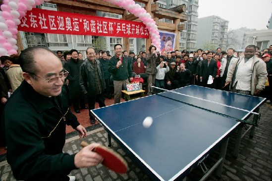 2007年4月12日,前世界冠军庄则栋与相声艺术家丁广泉的洋弟子共同为社区乒乓球赛开球。新华社/江峻