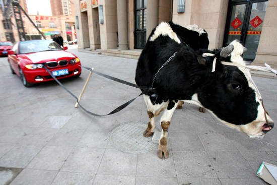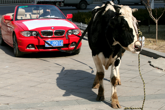 奶牛拉宝马漫步青岛街头 车主租牛拉车维权